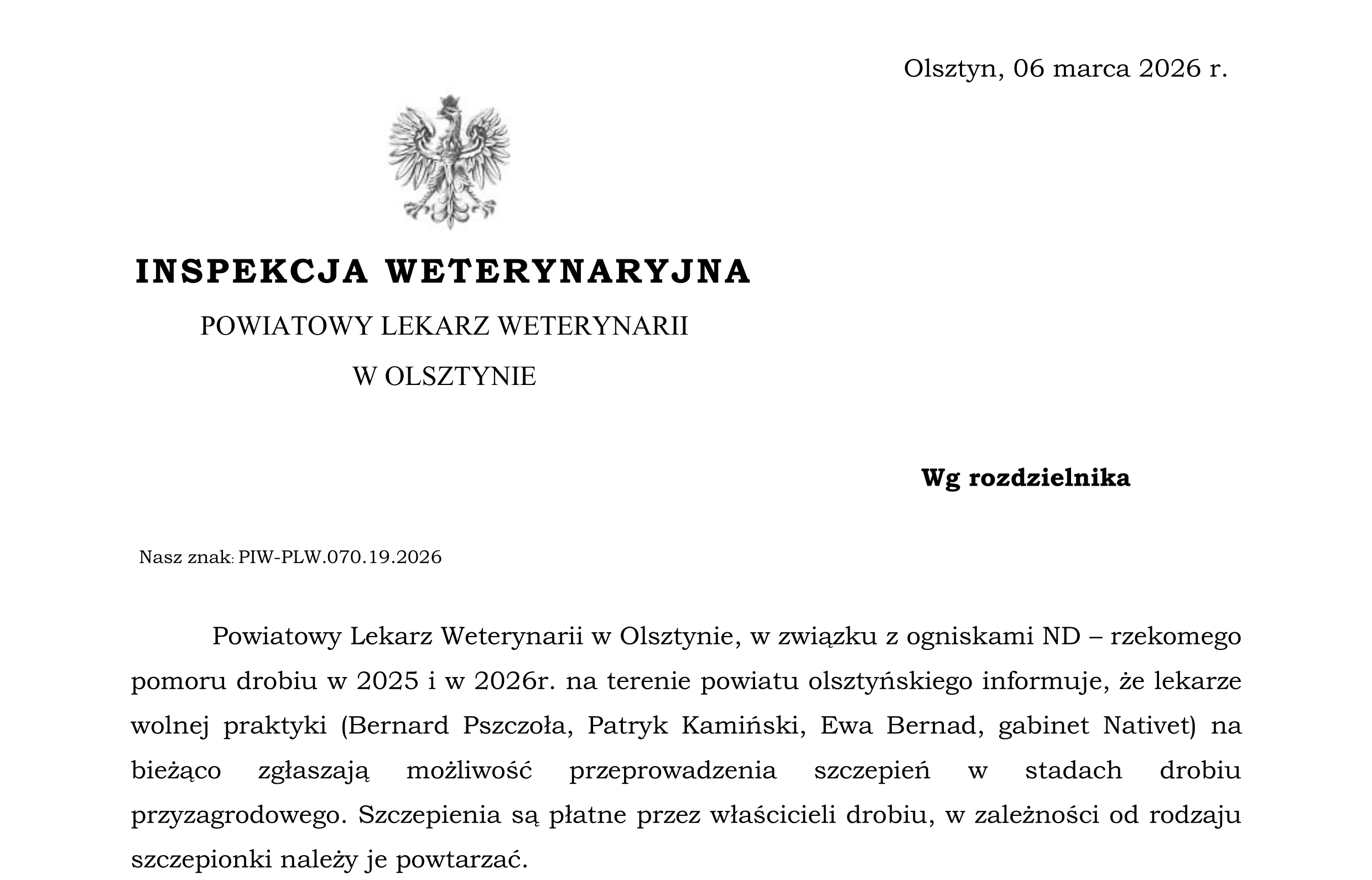 Informacja odnośnie możliwości przeprowadzenia szczepień w stadach drobiu przyzagrodowego w związku z pomorem drobiu w 2025 i 2026r.