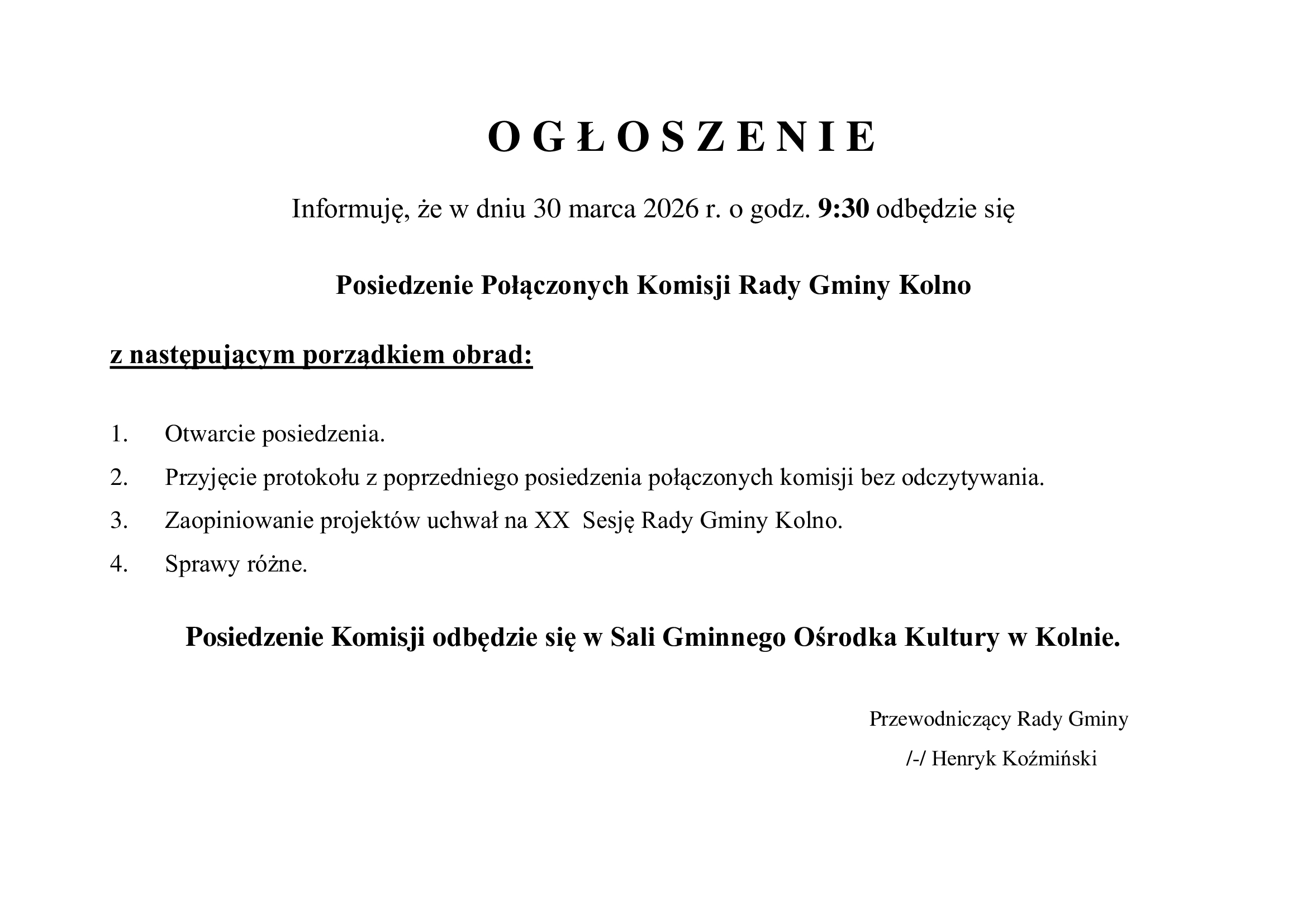Ogłoszenie - Posiedzenie połączonych komisji Rady Gminy Kolno
