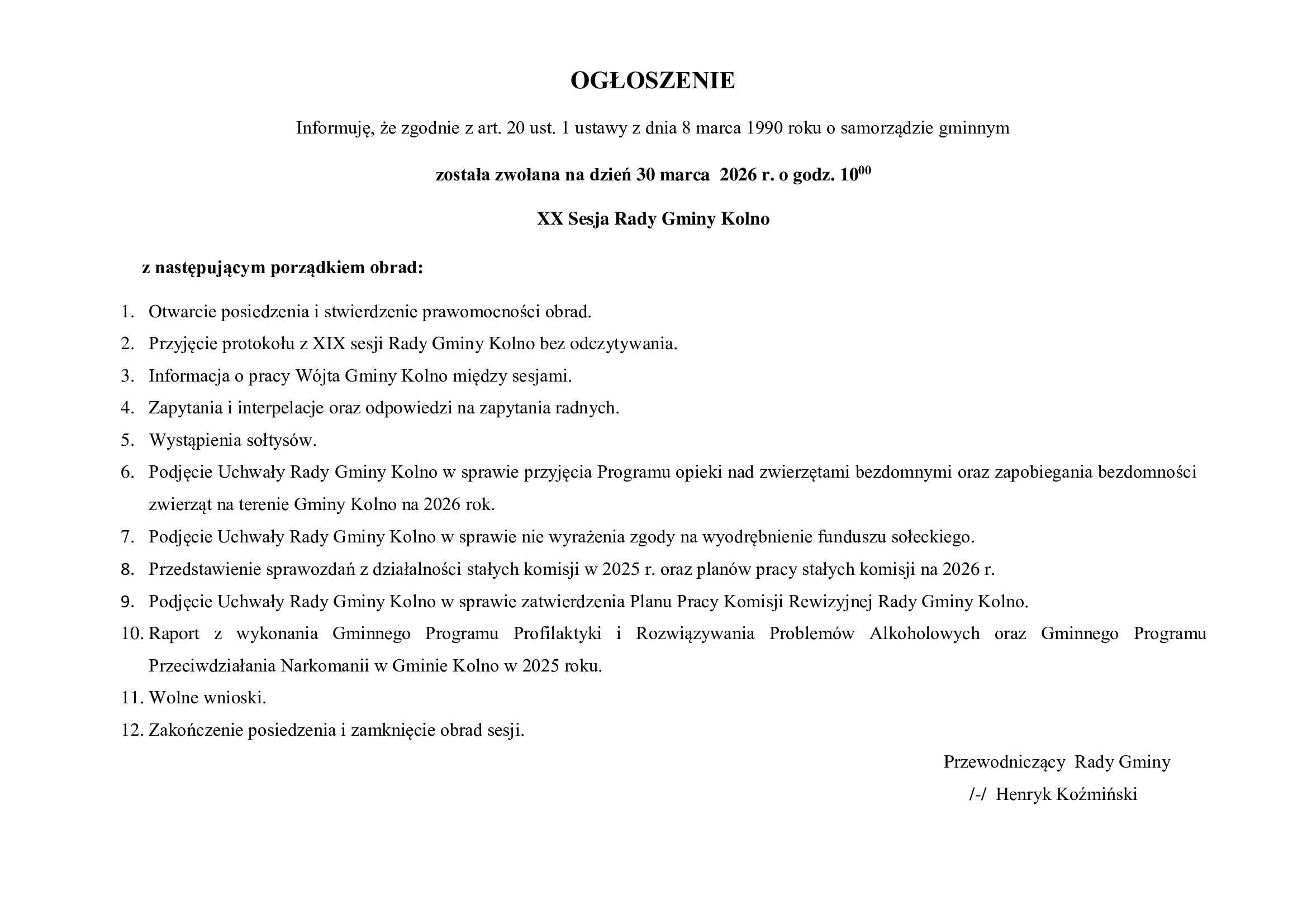 Ogłoszenie - XX sesja Rady Gminy Kolno