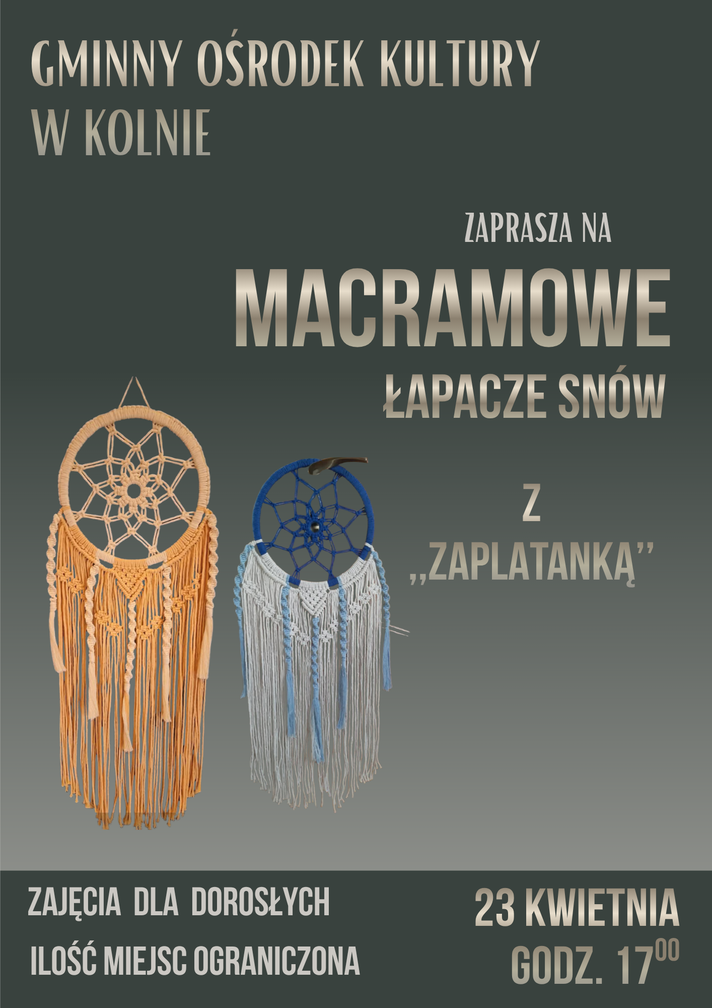 Gminny Ośrodek Kultury w Kolnie zaprasza na warsztaty makramowe, podczas których pod fachowym okiem instruktorki Zaplatanka uczestnicy poznają tradycyjną technikę plecenia i stworzą własny, unikalny łapacz snów.Warsztaty stanowią doskonałą okazję do twórczego spędzenia czasu oraz poszerzenia umiejętności manualnych w przyjaznej atmosferze.
