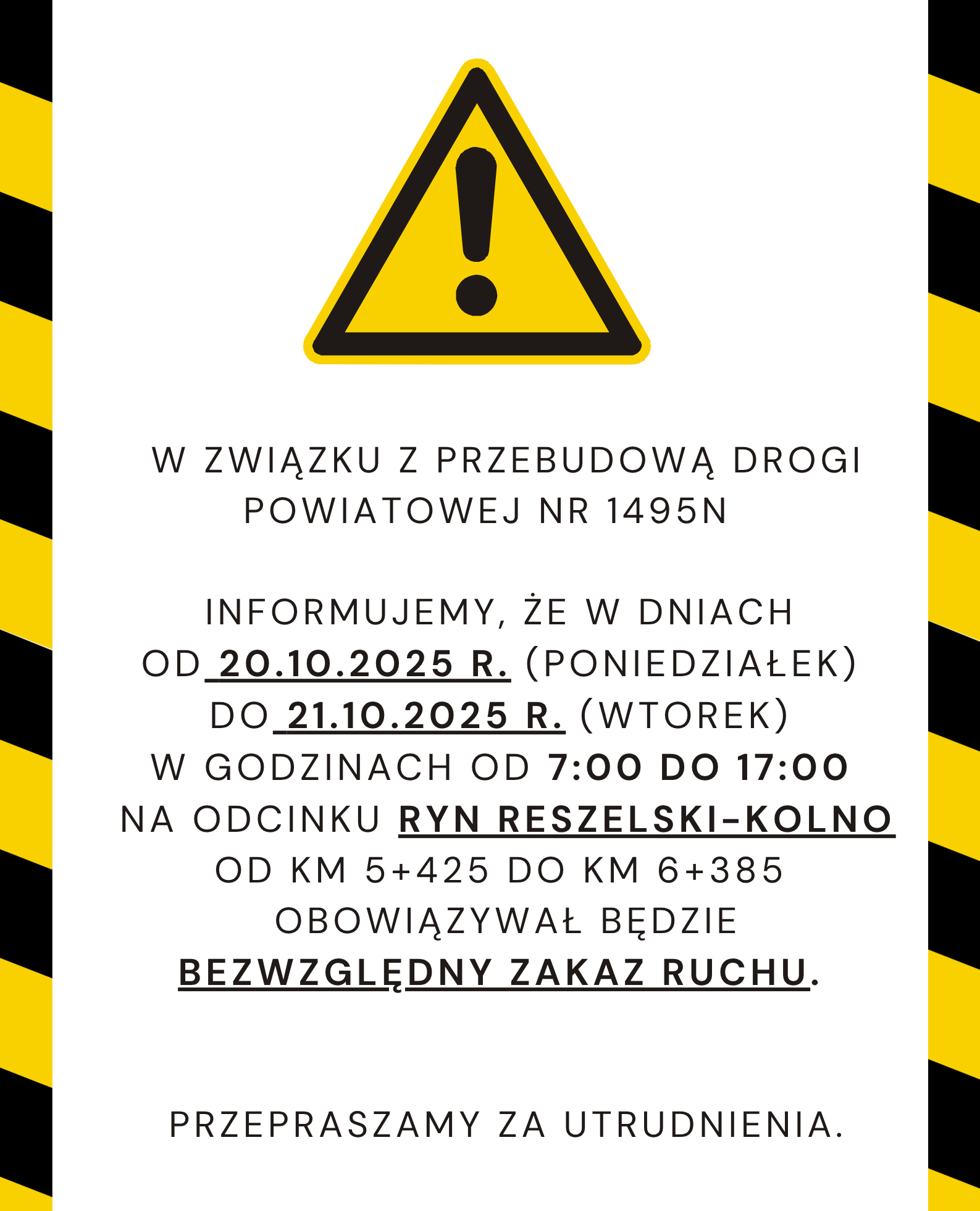 Uwaga! W dniach 20-21.10.2025 r. - bezwzględny zakaz ruchu na trasie Ryn Reszelski - Kolno (w godz. 7:00-17:00)
