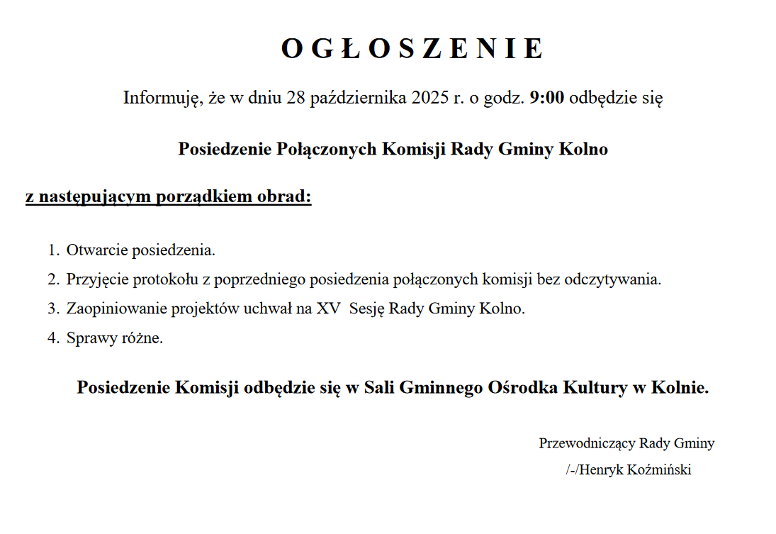Ogłoszenie - Posiedzenie Połączonych Komisji Rady Gminy Kolno - 28.10.2025r.