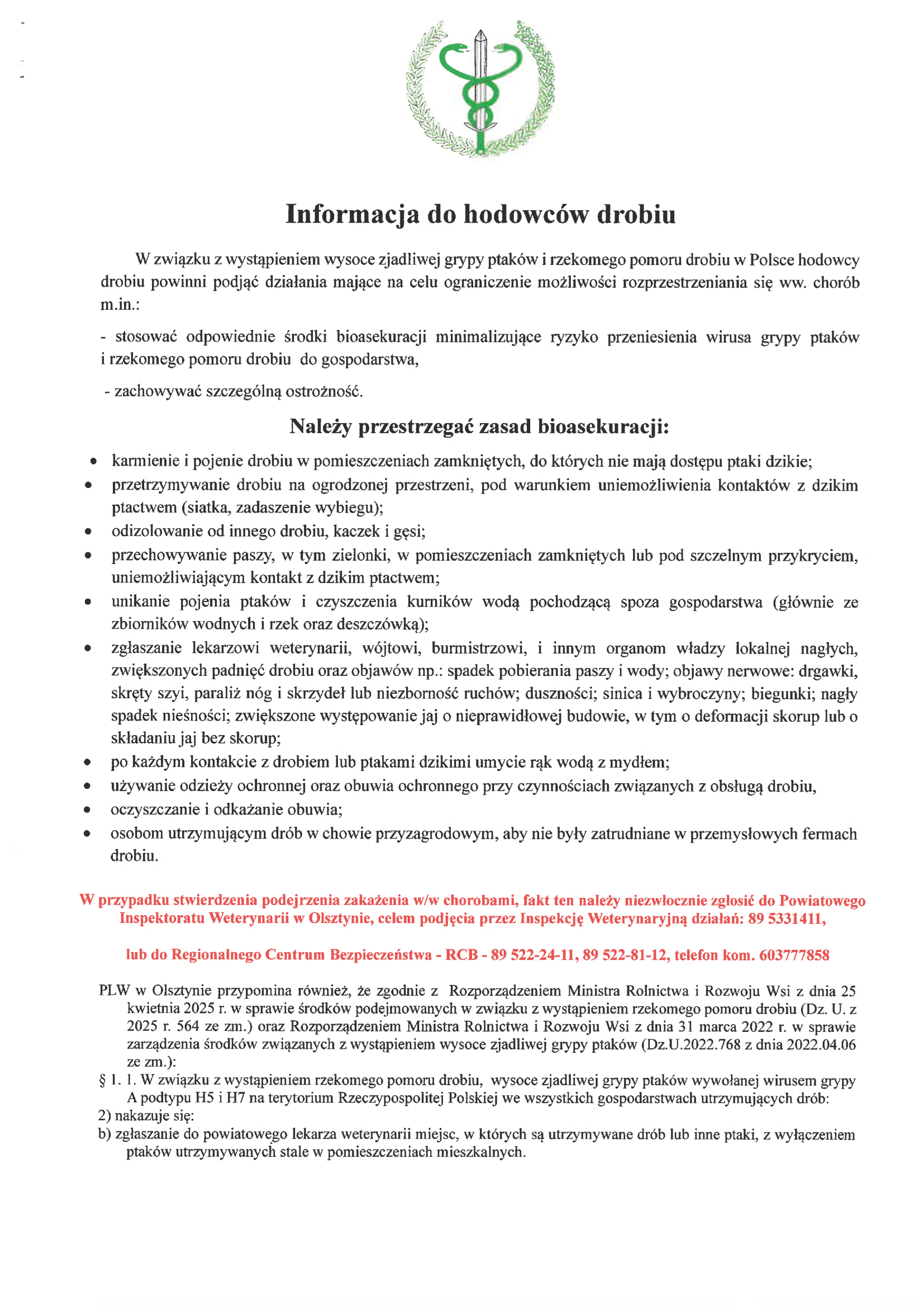 Informacja dla hodowców drobiu, w tym hodujących drób na własne potrzeby.