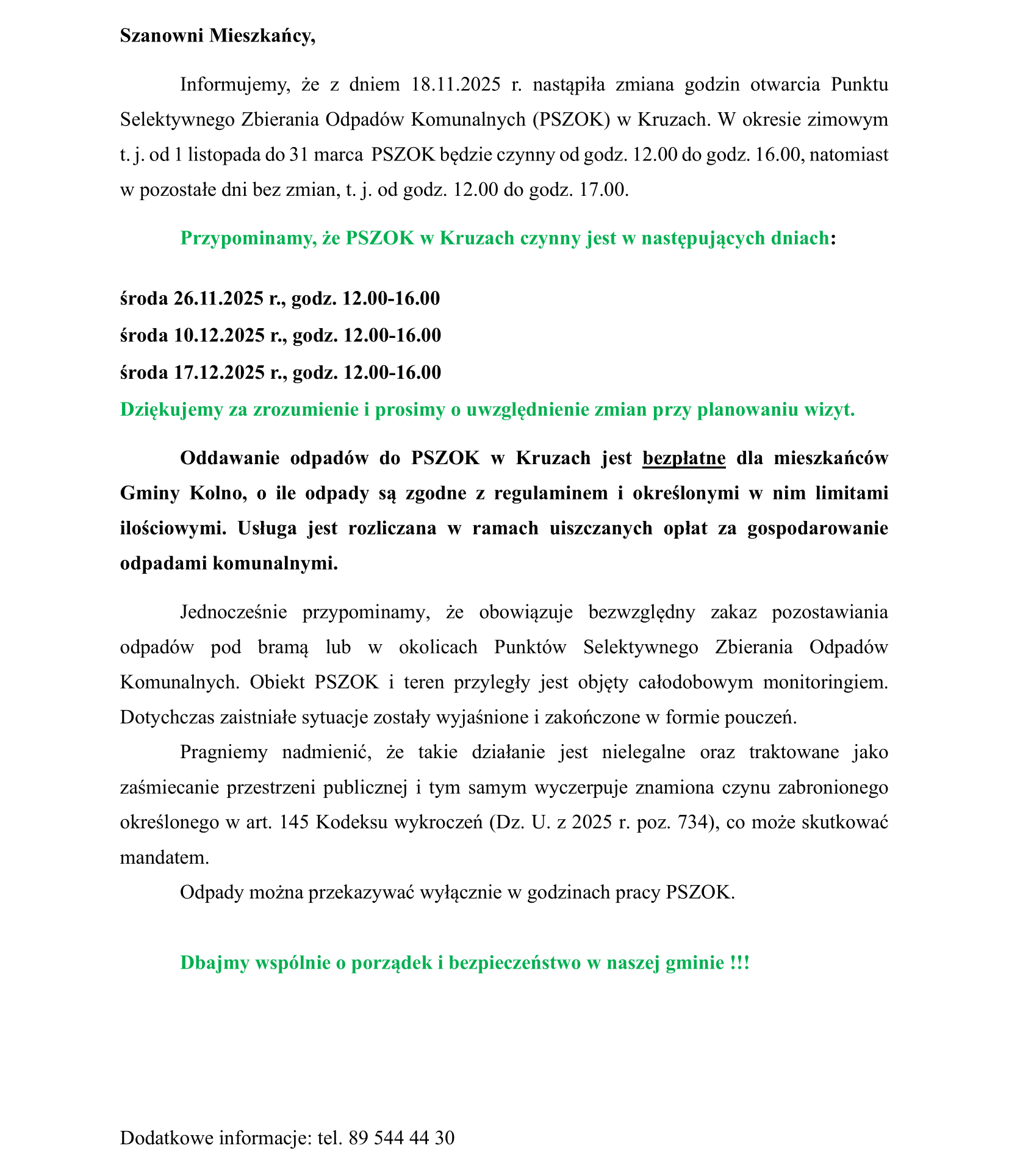 Zmiana godzin otwarcia Punktu Selektywnego Zbierania Odpadów (PSZOK) w Kruzach |
