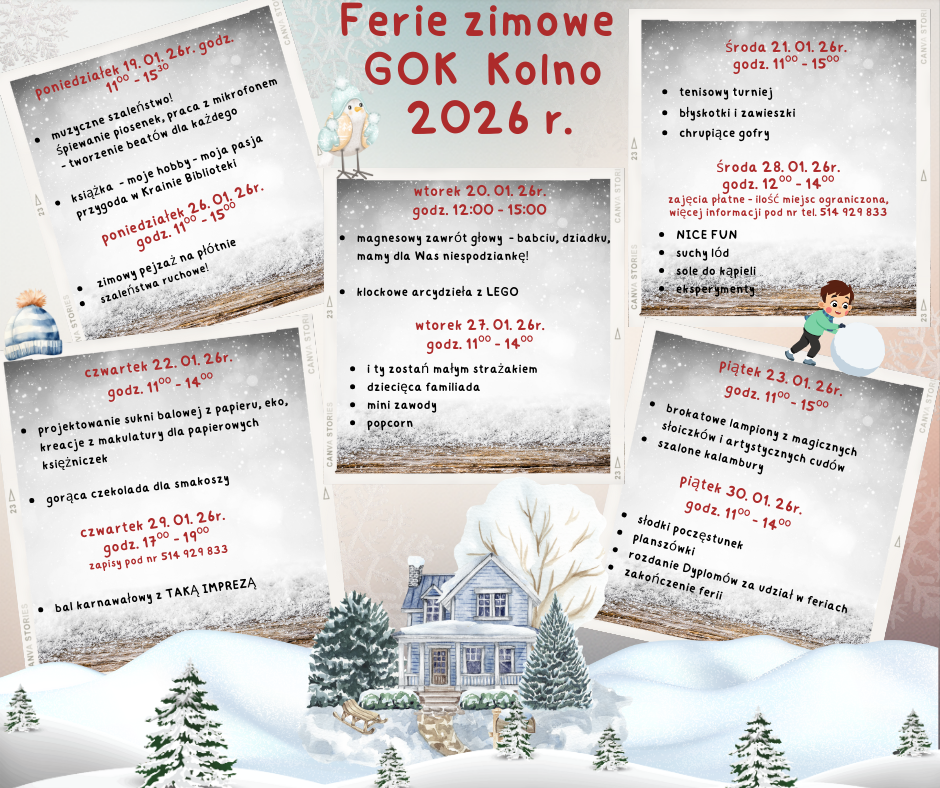 Gminny Ośrodek Kultury w Kolnie serdecznie zaprasza wszystkie dzieci i młodzież na ferie zimowe pełne radości, kreatywności i niezapomnianych wrażeń W trakcie ferii będziemy rozwijać swoje pasje, odkrywać nowe talenty oraz spędzać czas w gronie rówieśników w ciepłej, przyjaznej atmosferze.