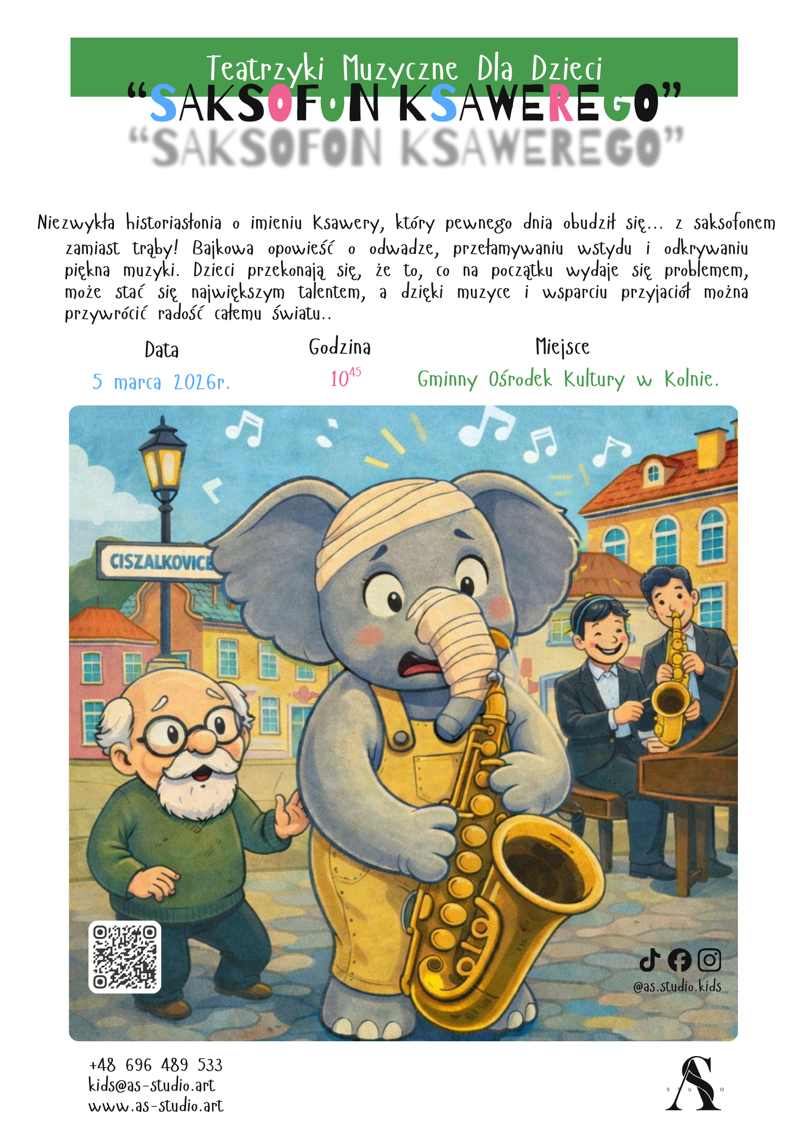 „SakSoFon Ksawerego” to niezwykły teatrzyk muzyczny, który już po raz drugi zawita do Gminnego Ośrodka Kultury w Kolnie! Tym razem przeniesiemy się do bajkowego świata, w którym słoń Ksawery pewnego dnia budzi się… z saksofonem zamiast trąby!