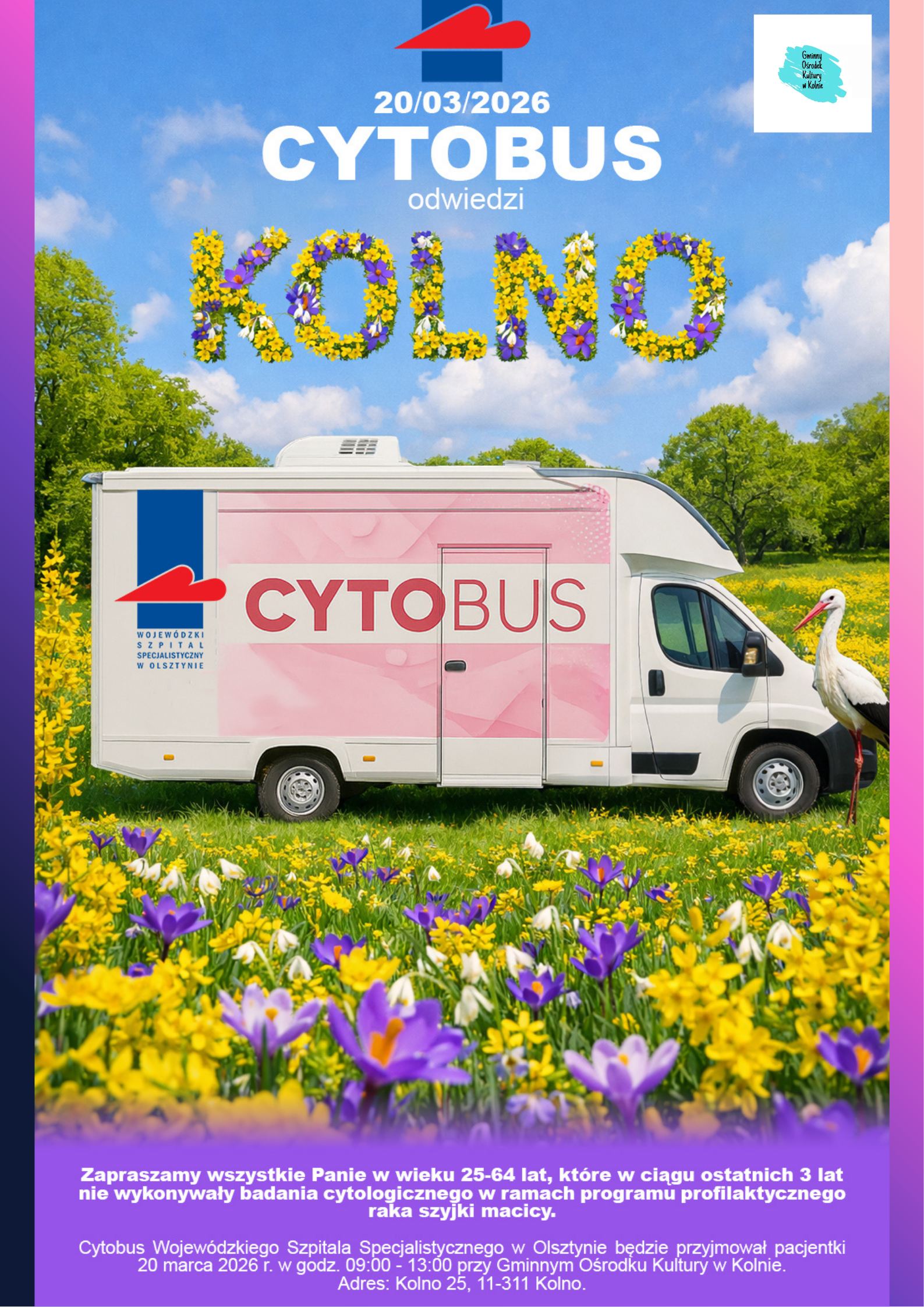 W ramach obchodów Miesiąca Kobiet Gminny Ośrodek Kultury w Kolnie zaprasza panie na bezpłatne badania cytologiczne realizowane w CYTOBUSIE Wojewódzkiego Szpitala Specjalistycznego w Olsztynie.