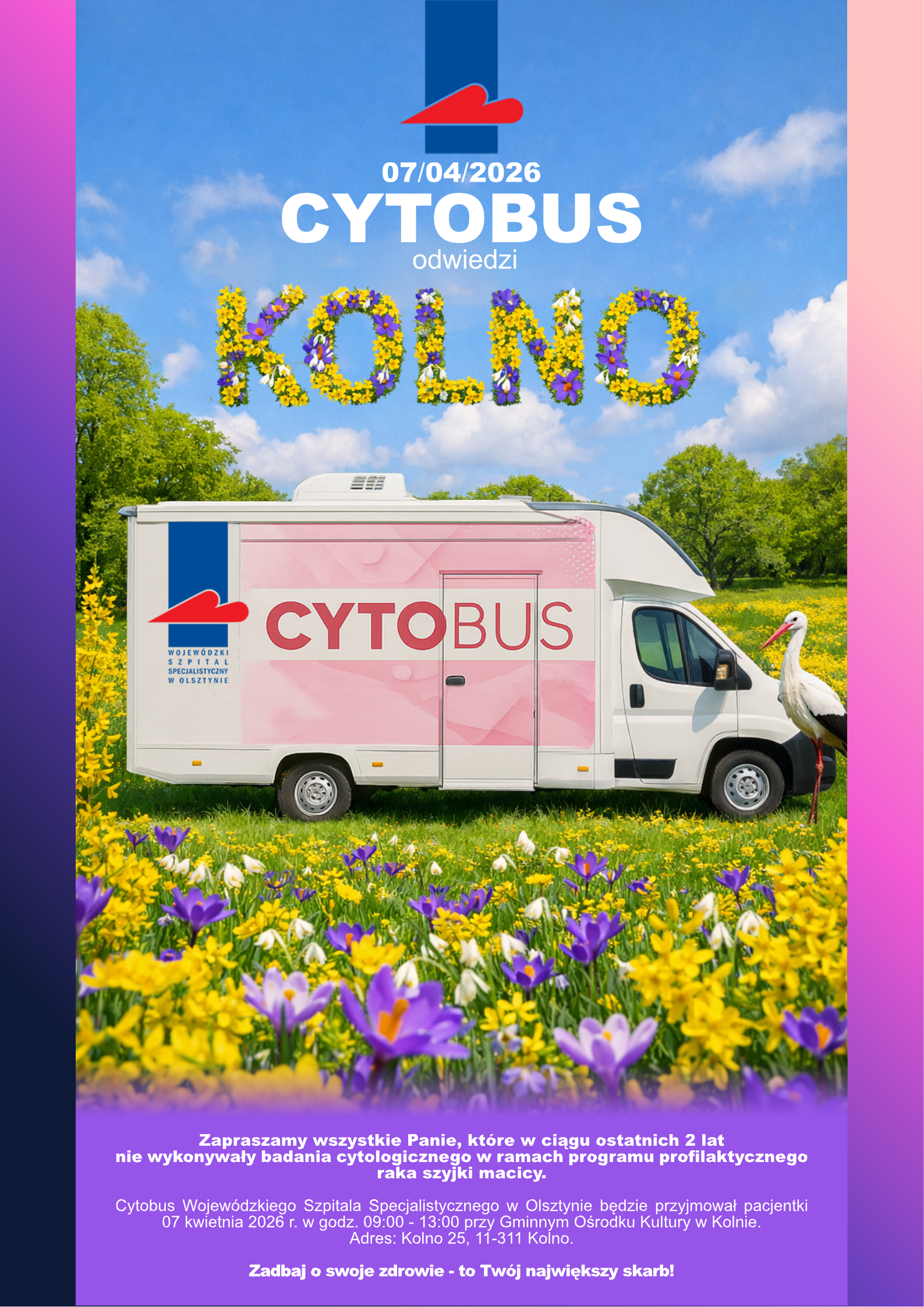 Wracamy do Państwa z przepiękną akcją na BEZPŁATNE BADANIE CYTOLOGICZNE. Już niedługo przyjedzie wyczekiwany CYTOBUS z Wojewódzkiego Szpitala Specjalistycznego w Olsztynie, w którym będzie można wykonać badanie w komfortowych warunkach.