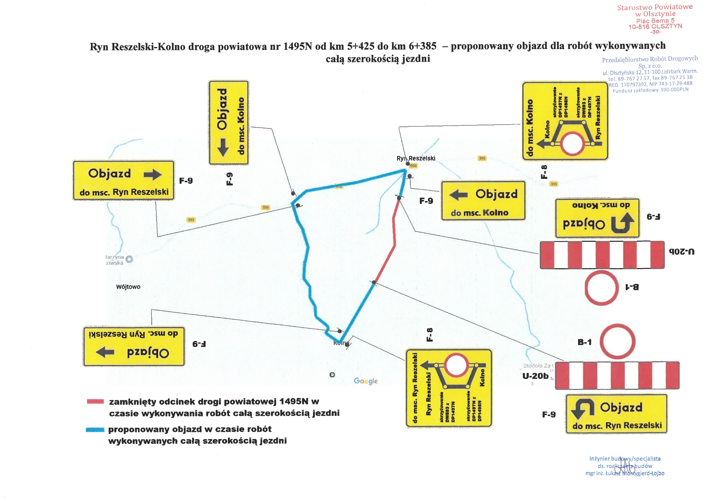 Informuję, że od dnia 24 września 2025 r. rozpoczynają się prace związane z przebudową drogi powiatowej nr 1495N relacji Ryn Reszelski – Kolno na odcinku KM5+425 do KM 6+385 w ramach Rządowego Funduszu Rozwoju Dróg.