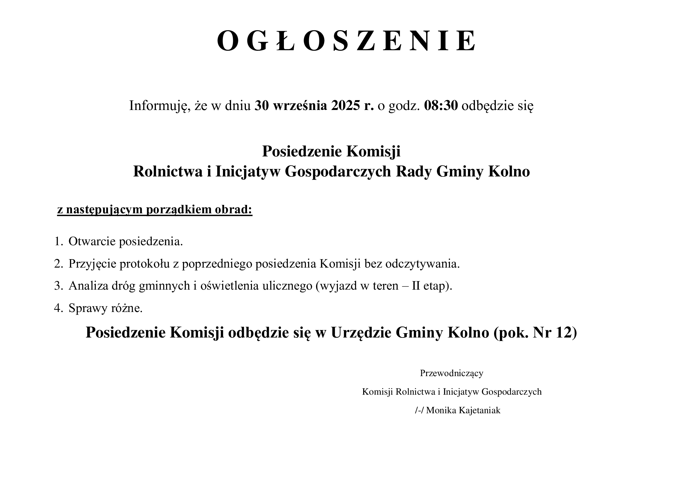 Ogłoszenie - Posiedzenie Komisji Rolnictwa i Inicjatyw Gospodarczych |