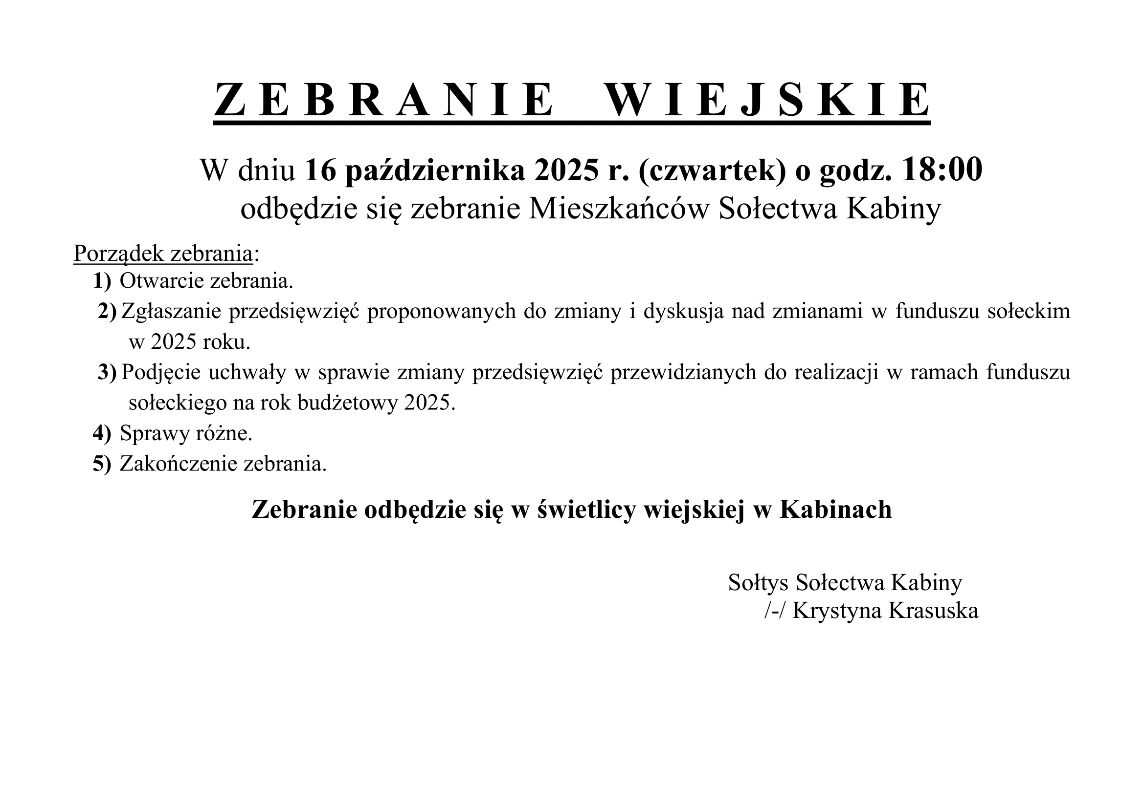 OGŁOSZENIE - Zebranie Wiejskie Mieszkańców Sołectwa Kabiny w sprawie zmiany przedsięwzięć przewidzianych do realizacji z funduszu sołeckiego w 2025 r. |