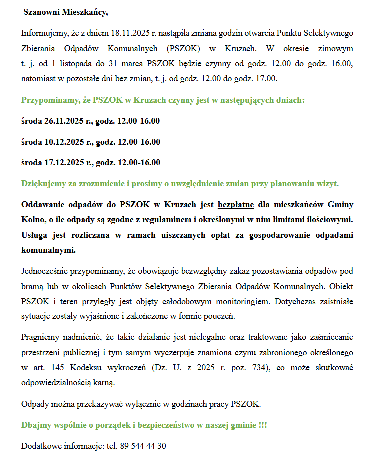 Zmiana godzin otwarcia Punktu Selektywnego Zbierania Odpadów (PSZOK) w Kruzach |