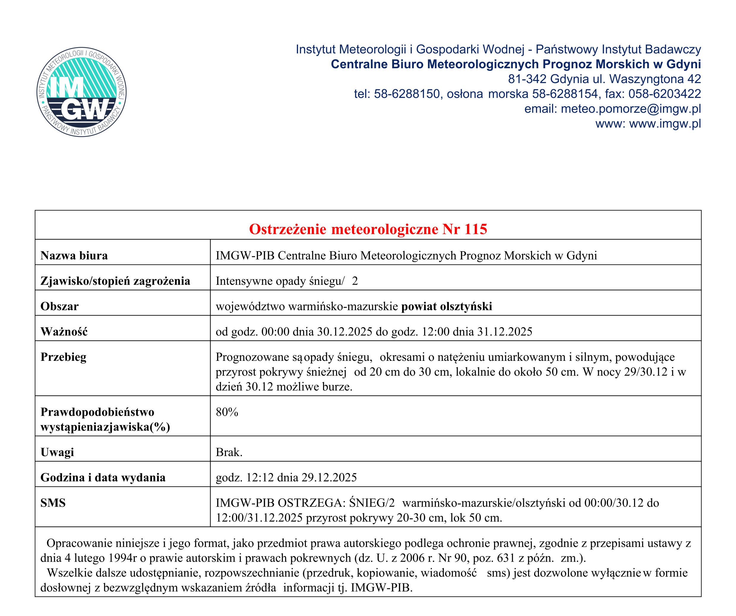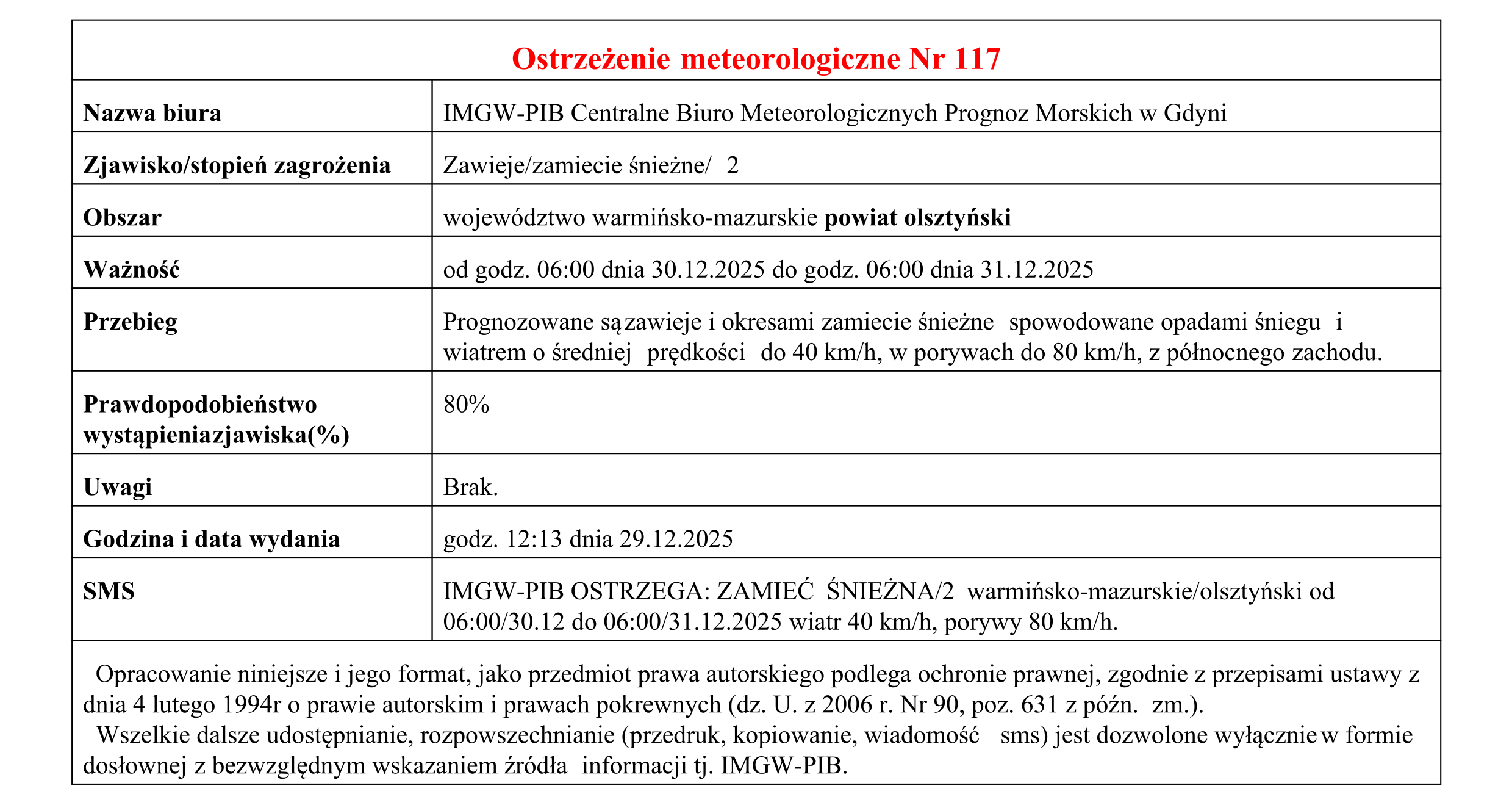 Ostrzeżenia meteorologiczne - Silny wiatr i intensywne opady śniegu!