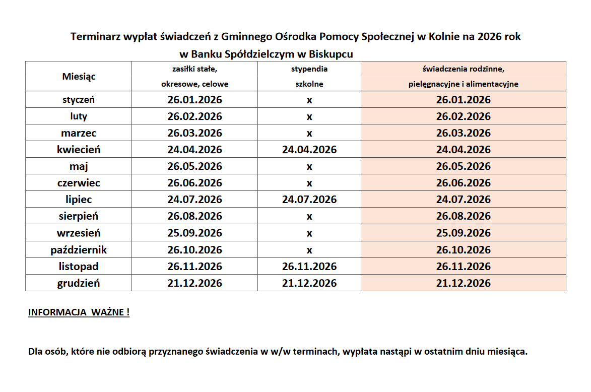 Terminarz wypłat świadczeń z Gminnego Ośrodka Pomocy Społecznej w Kolnie na 2026 rok