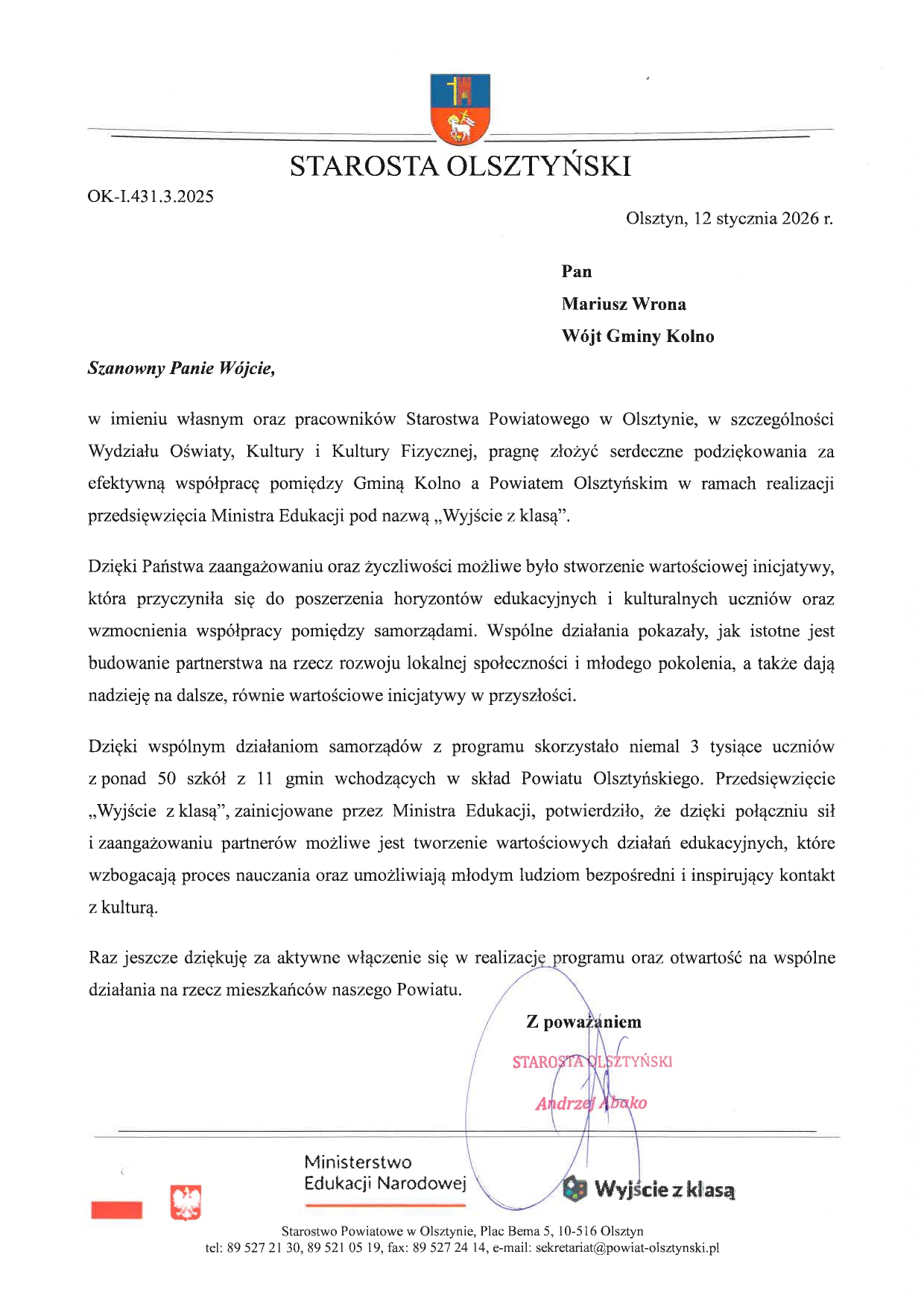 Z tego miejsca również dziękuję za dobrą współpracę oraz zaangażowanie Starostwa Powiatowego w Olsztynie w realizację przedmiotowego programu.