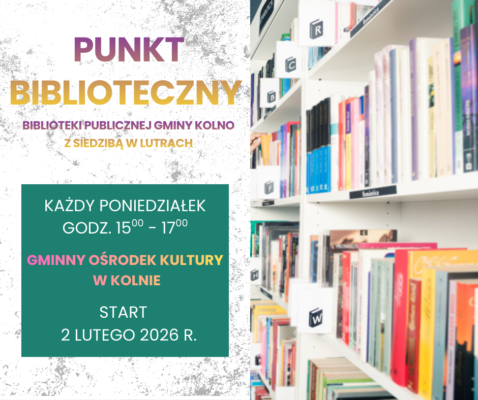 Z przyjemnością informujemy, że w Gminnym Ośrodku Kultury w Kolnie powstaje punkt biblioteczny Biblioteki Publicznej Gminy Kolno z siedzibą w Lutrach.