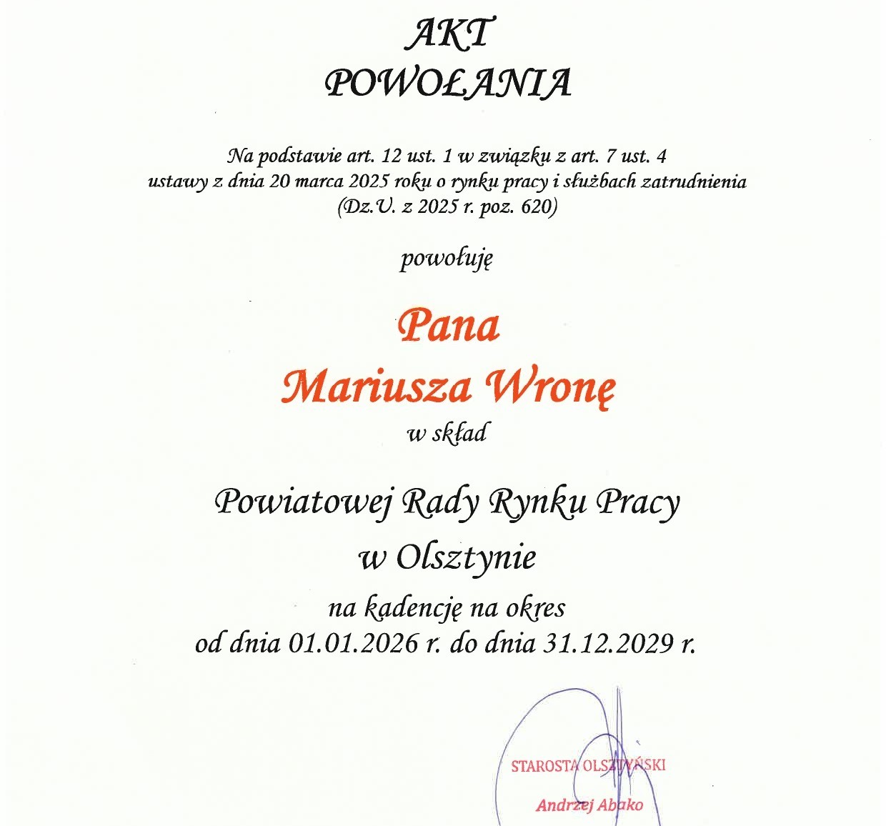 Powiatowa Rada Rynku Pracy, do której zostałem powołany Zarządzeniem nr 82/2025 Starosty Olsztyńskiego, jest organem opiniodawczo-doradczym Starosty w zakresie aktywności zawodowej, wspierania zatrudnienia oraz polityki rynku pracy.