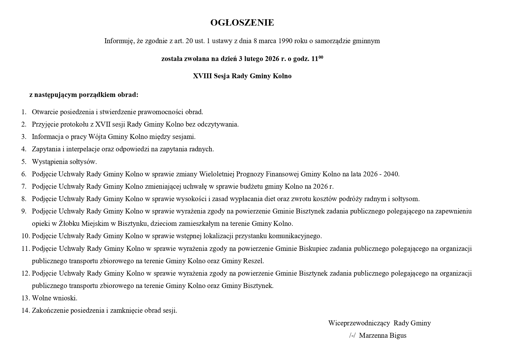 OGŁOSZENIE - XVIII SESJA RADY GMINY KOLNO