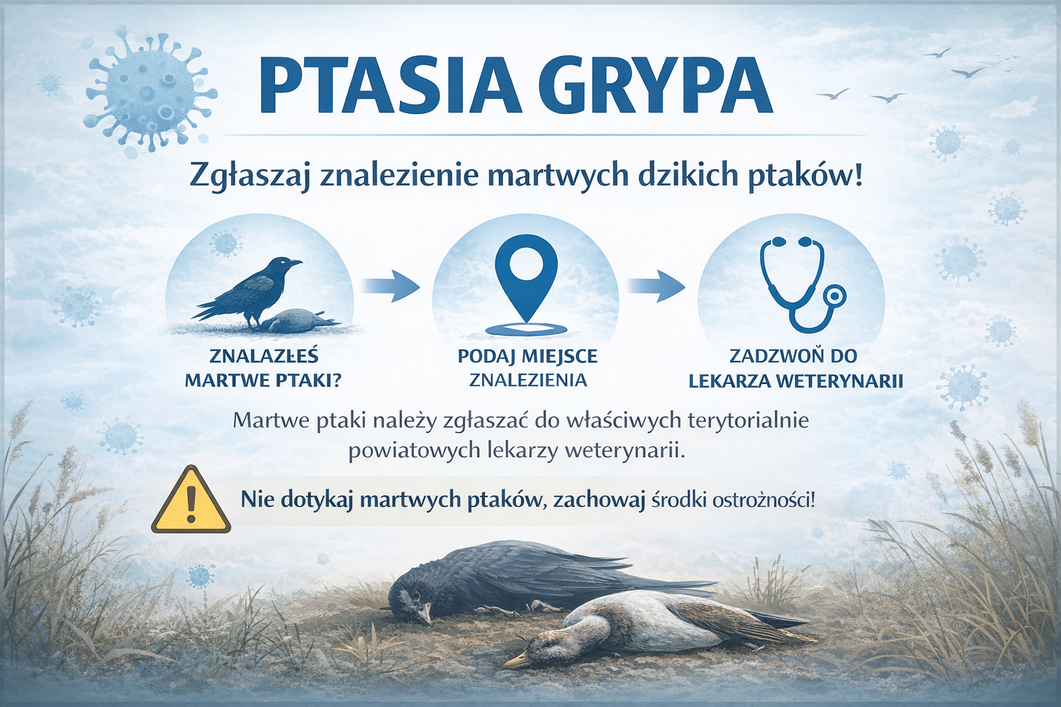 W związku z pismem Nr WIW-Z-ZZ.913.9.3.2026 Warmińsko-Mazurskiego Wojewódzkiego Lekarza Weterynarii z dnia 12 lutego 2026 roku w sprawie zagrożenia wysoce zjadliwą grypą ptaków oraz rzekomym pomorem drobiu informujemy o konieczności zgłaszania właściwym terytorialnie powiatowym lekarzom weterynarii przypadków znalezienia zwłok ptaków drapieżnych oraz ptaków związanych ze środowiskiem wodnym (kaczek, gęsi, łabędzi, mew, rybitw).